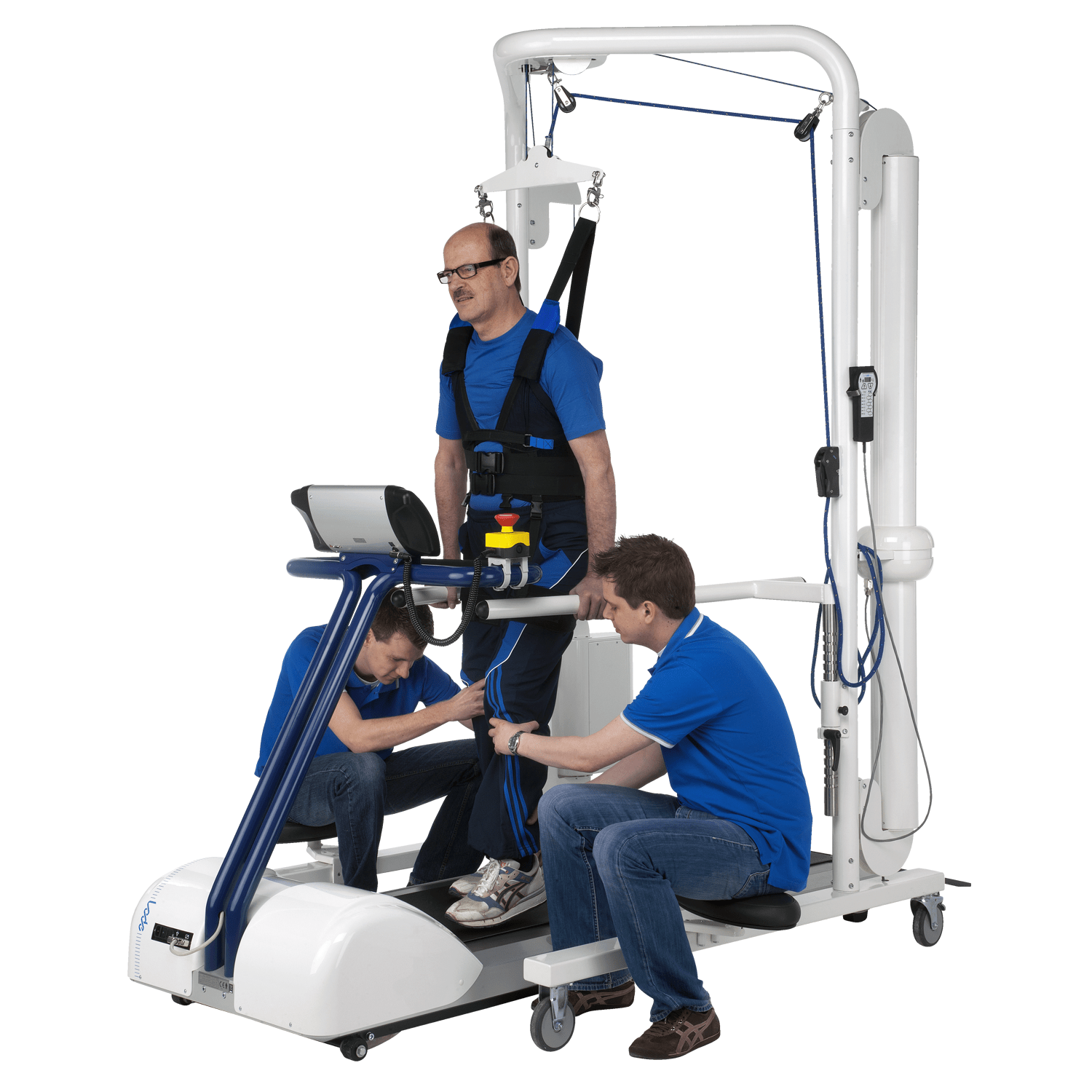 The Lode Body Weight Support System (BWSS) is especially developed to support patients that are not able to walk independently. They need support in order to be able to learn how to walk again. The Lode BWSS is the perfect product to enable this. During the training session, the patient weight can be supported accurately up to 80 kg, allowing a broad range of patients to use the system. The compensation weight can easily be adjusted with a remote control. The weight is compensated through a Unique use of spring combinations, which is a breakthrough and provides the most stable compensation system. This system is suitable for treadmills with a maximum walking surface width of 60 cm. It is standard supplied with a harness size M.